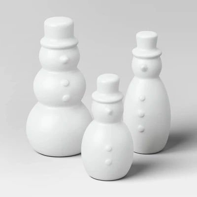 - Includes 3 black metal houses, 6 bottle brush trees, 3 snowman figurines
