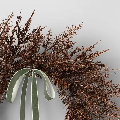 Bring rustic, autumnal charm to your decor with this 24-inch Christmas Copper Wreath from Wondershop™. This circular wreath is adorned with a dense arrangement of sprigs in a dark copper color and accented with a green velvet bow hanging from the inner top with long trailing ties. Perfect for both indoor and sheltered outdoor use, the wreath adds warmth and seasonal style to your front door, wall or mantel.
