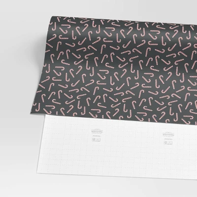 Finish your festive packages with flair using this Christmas Candy Canes Tumble on Black Gift Wrap from Wondershop™. Featuring allover candy cane prints on a black background, this festive gift wrap adds the perfect holiday cheer to your gifts. This paper gift wrap comes in a 220-foot length roll, making it ideal for wrapping a variety of holiday presents.