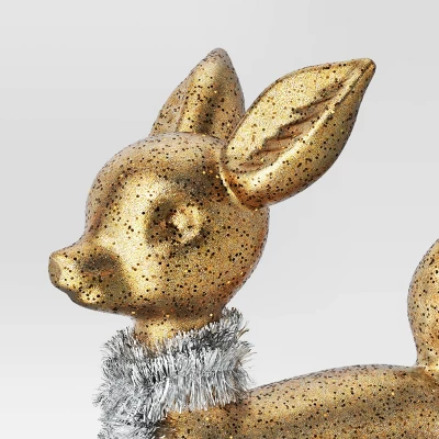 Spread the festive cheer by decorating your home with this Deer Decor from Wondershop™. Designed in a gold-tone hue for a luxurious appeal, this standing deer decor boasts a speckled finish and features a silver-tone tinsel garland with bells for a fun, jolly vibe. You can place this 11.75-inch decor on a mantel either alone or pair it with other accent pieces for a cohesive festive display.